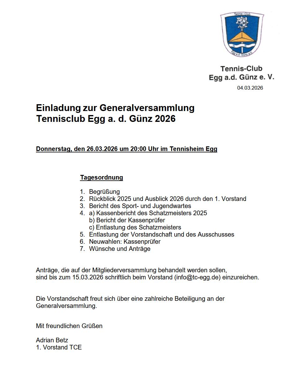 Die Einladung kann hier heruntergeladen werden. Anträge sind bis zum 15.03. schriftlich beim Vorstand (info@tc-egg.de) einzureichen. Wir freuen uns über eine zahlreiche Beteiligung.
